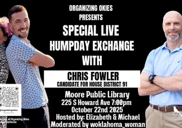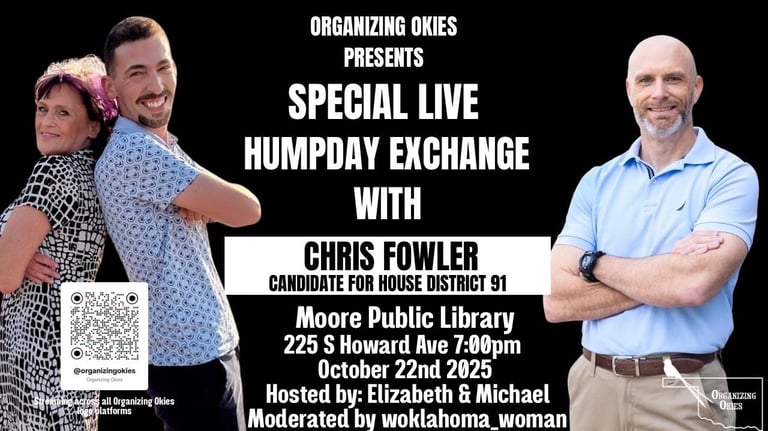 Join us for a special in-person HumpDay Exchange where our hosts sit down with Democratic candidate OK HD91, Chris Fowler, in Moore, OK 10/22/25 7pm Moore Library